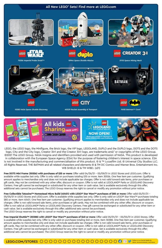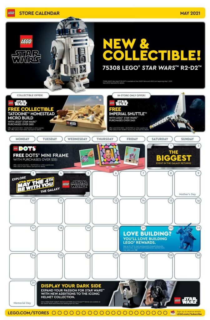Se acaba de hacer público el calendario de promociones de LEGO para el mes de Mayo en la LEGO Store y tiendas oficiales. Destacan las promociones de los sets de LEGO Star Wars de Tatooine Homestead, que ya os comentamos en este artículo, y el de un LEGO Star Wars Imperial Shuttle que estaba sin conocer.