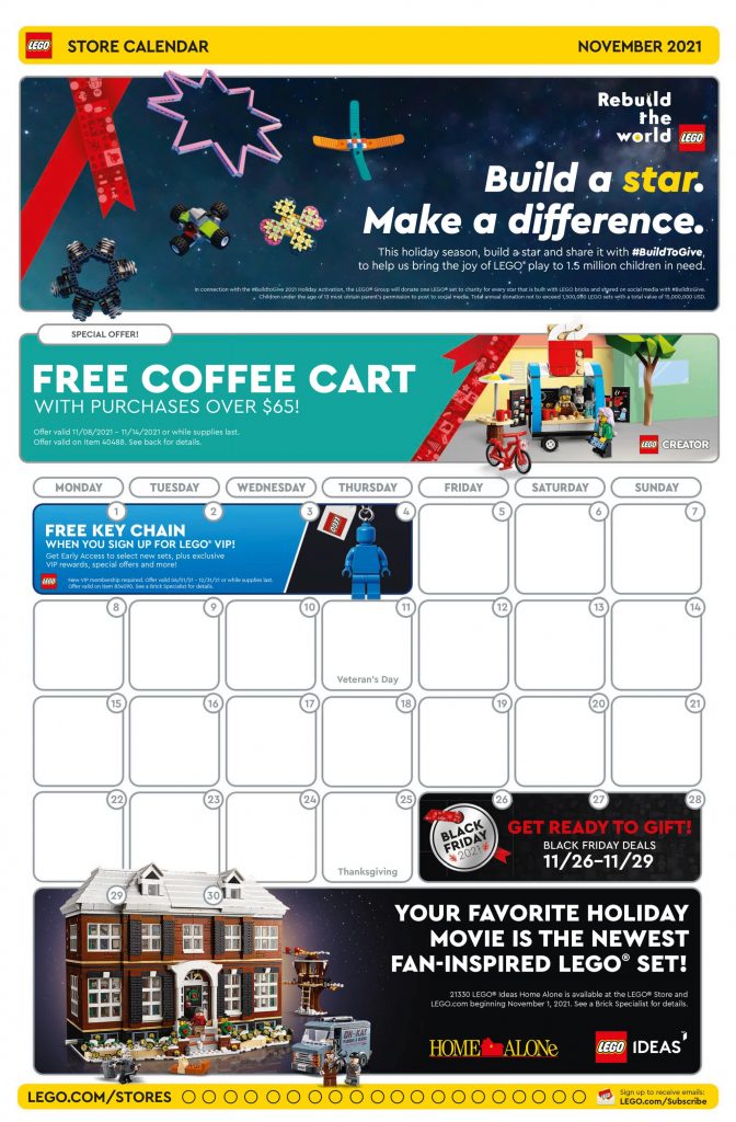 Como es habitual al final de cada mes, hoy descubrimos el calendario de noviembre de la LEGO Store con sus promociones habituales. Encontramos algunas promociones ya conocidas como el llavero gratuito para nuevos usuarios VIP de la LEGO Store o la puesta a la venta de LEGO Creator Sólo en Casa (21330) , del que ya os hablamos aquí.