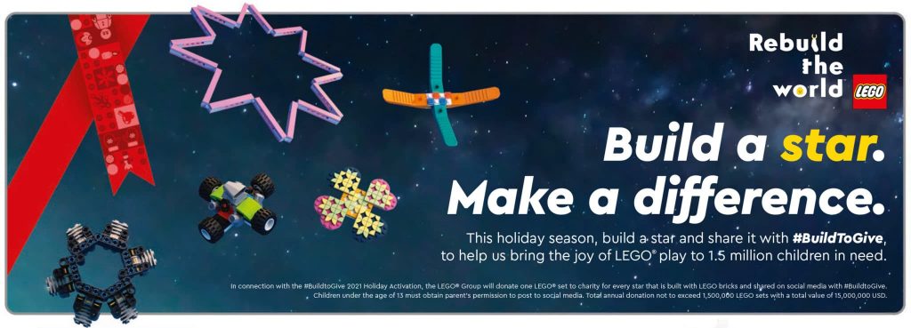 LEGO vuelve a renovar su campaña anual #BuildToGive y aparece en la parte superior del folleto. Su meta es construir una estrella y compartirla en las redes sociales con el hashtag #BuildToGive .