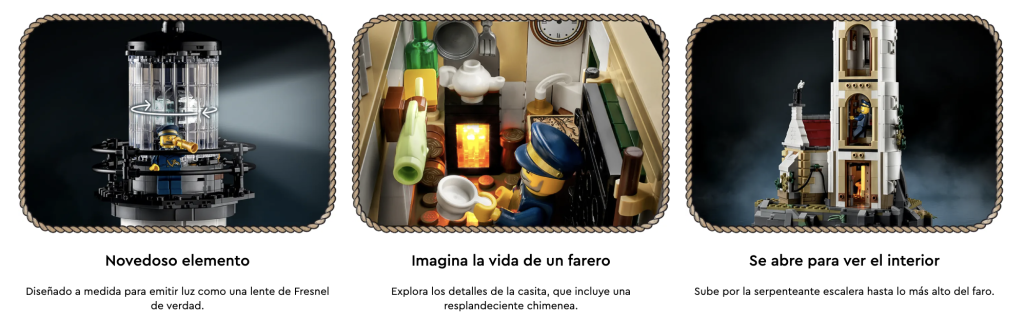 - Modelo Faro Motorizado (21335) para exponer: Arroja un rayo de luz sobre la creatividad con este detalladísimo faro construible situado en un afloramiento rocoso, con un muelle y escalones, una cueva y la casita del farero
