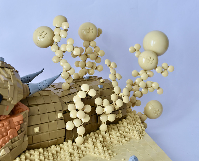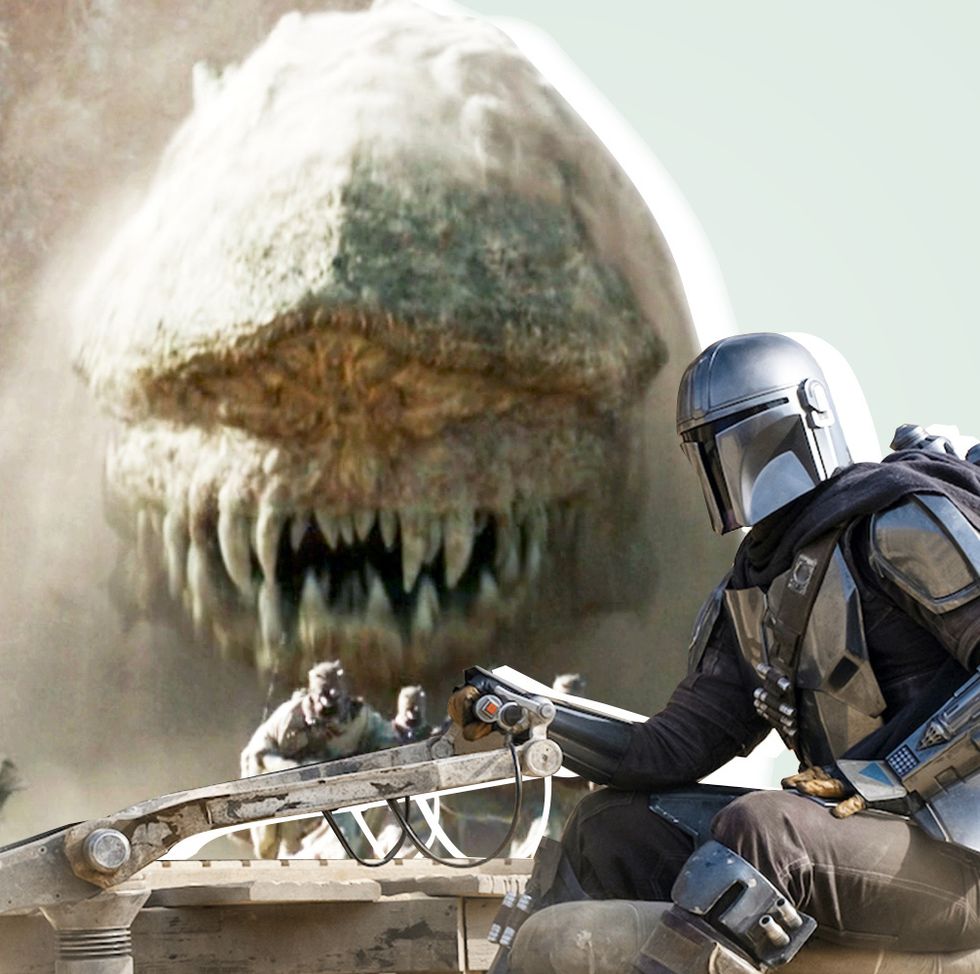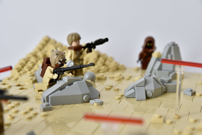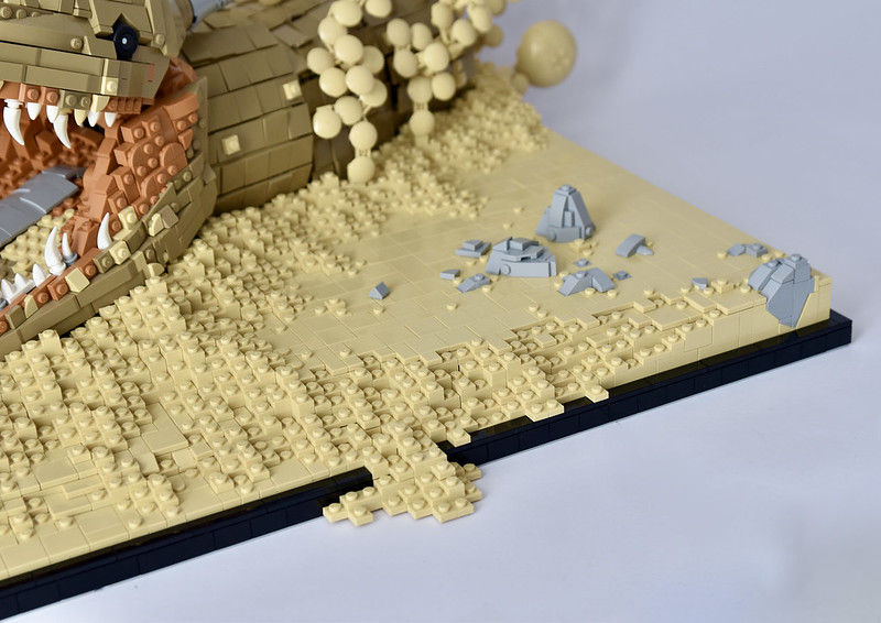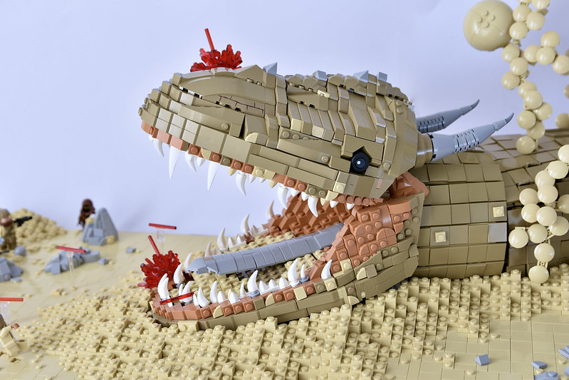 Es el caso de este MOC creado por First Order Lego en Flickr en donde escenifica en el mundo LEGO la escena en donde el protagonista de la serie The Mandalorian intenta acabar con el monstruo de las arenas, un dragón krayt, junto con una manada de jawas.
